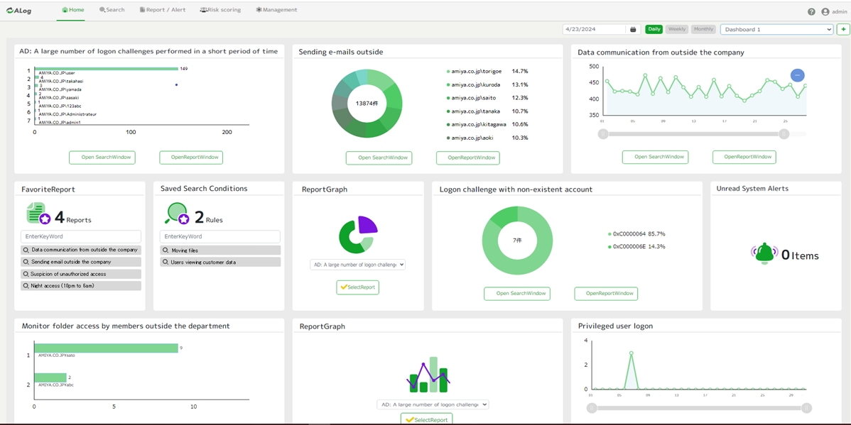 - ผู้บริหาร: หลายครั้งที่ฝ่ายบริหารจะมิอาจทราบข้อมูลข้อเท็จจริงจากบันทึกของระบบโดยตรง เพราะต้องใช้ความรู้ความเข้าใจด้านเทคนิคอย่างลึกซึ้ง แต่ด้วยระบบ Report ที่เนื้อหาถูกกลั้นกรองด้วย ALog มาแล้ว ผู้บริหารสามารถรับรู้รับทราบเหตุการณ์การเข้าถึงข้อมูลสำคัญต่างๆ ที่เกิดขึ้นในบริษัทได้โดยทันที ทั้งที่เป็นปกติและผิดปกติ