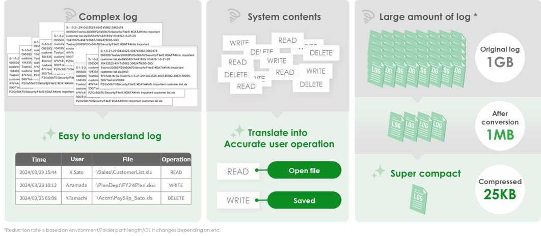 ALog ใช้เทคโนโลยีการสกัดเนื้อหาใจความ และการบีบอัดข้อมูลขั้นสูง ช่วยลดขนาดของไฟล์ Log ลงได้อย่างมาก ประหยัดพื้นที่จัดเก็บข้อมูลของคุณ